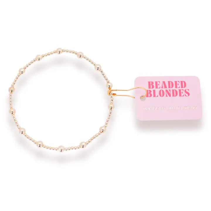Gold 3mm with 7 freshwater pearls. Our gold stackable beaded bracelets are available in a variety of bead sizes and lengths to fit every wrist. Made from 14 k gold filled beads so perfect for everyday wear! Sweat proof, water proof and tarnish free! Handstrung with love in College Station, Texas.