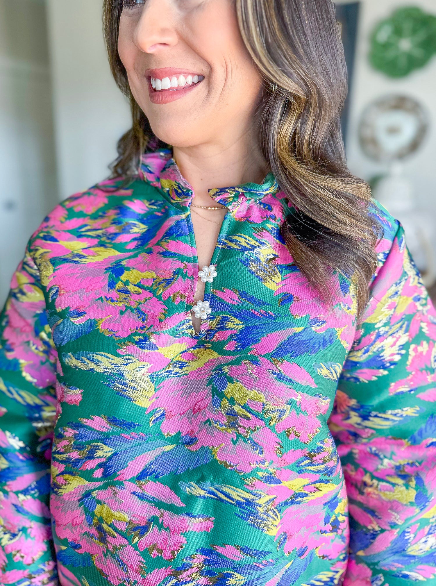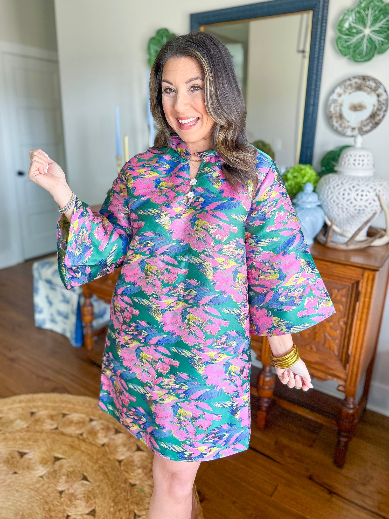 Brianna's signature ruffle neck luxury caftan is whimsical yet sophisticated; a nod to Brianna's favorite fashion era -- the 1960-70's.
