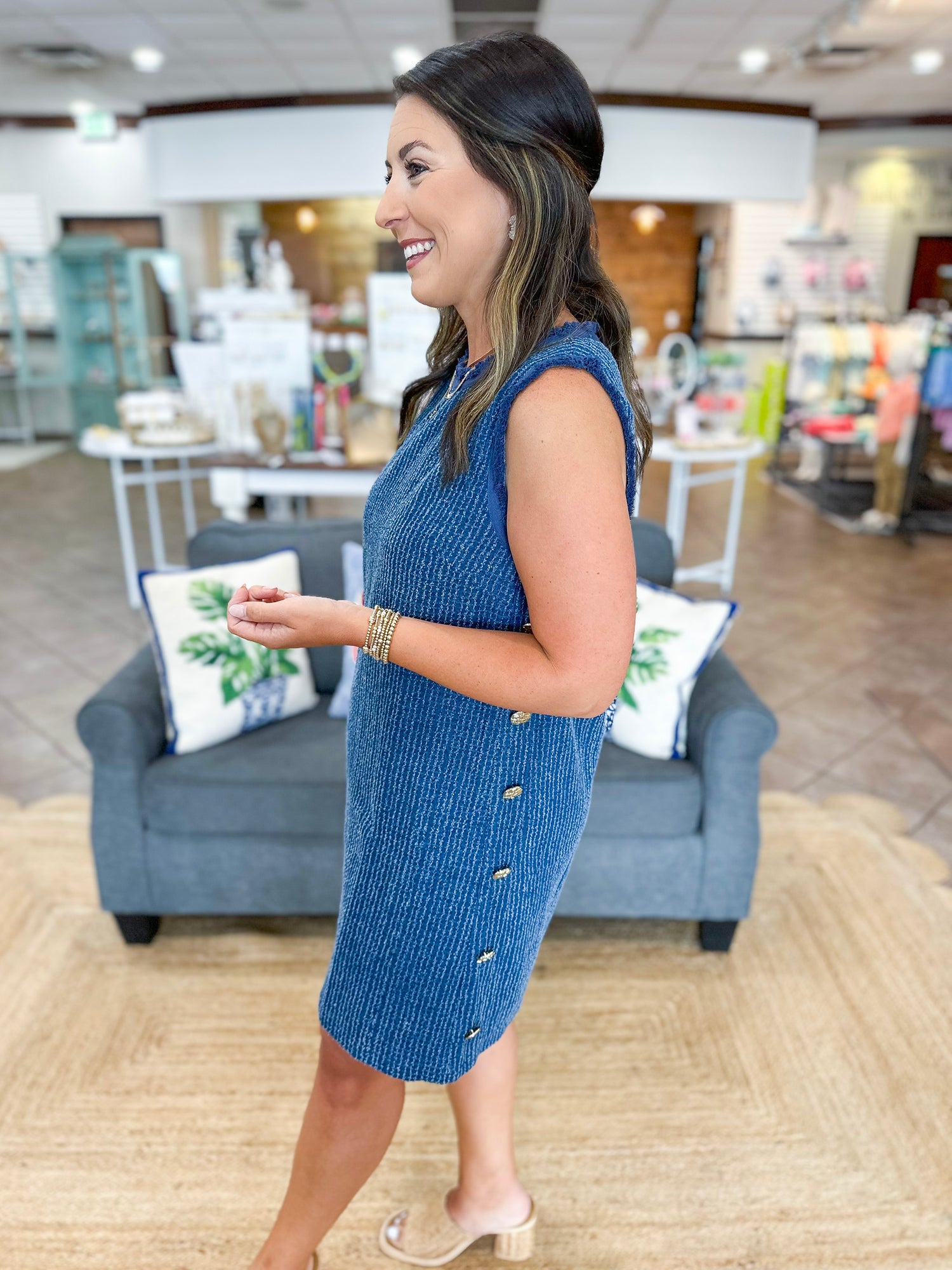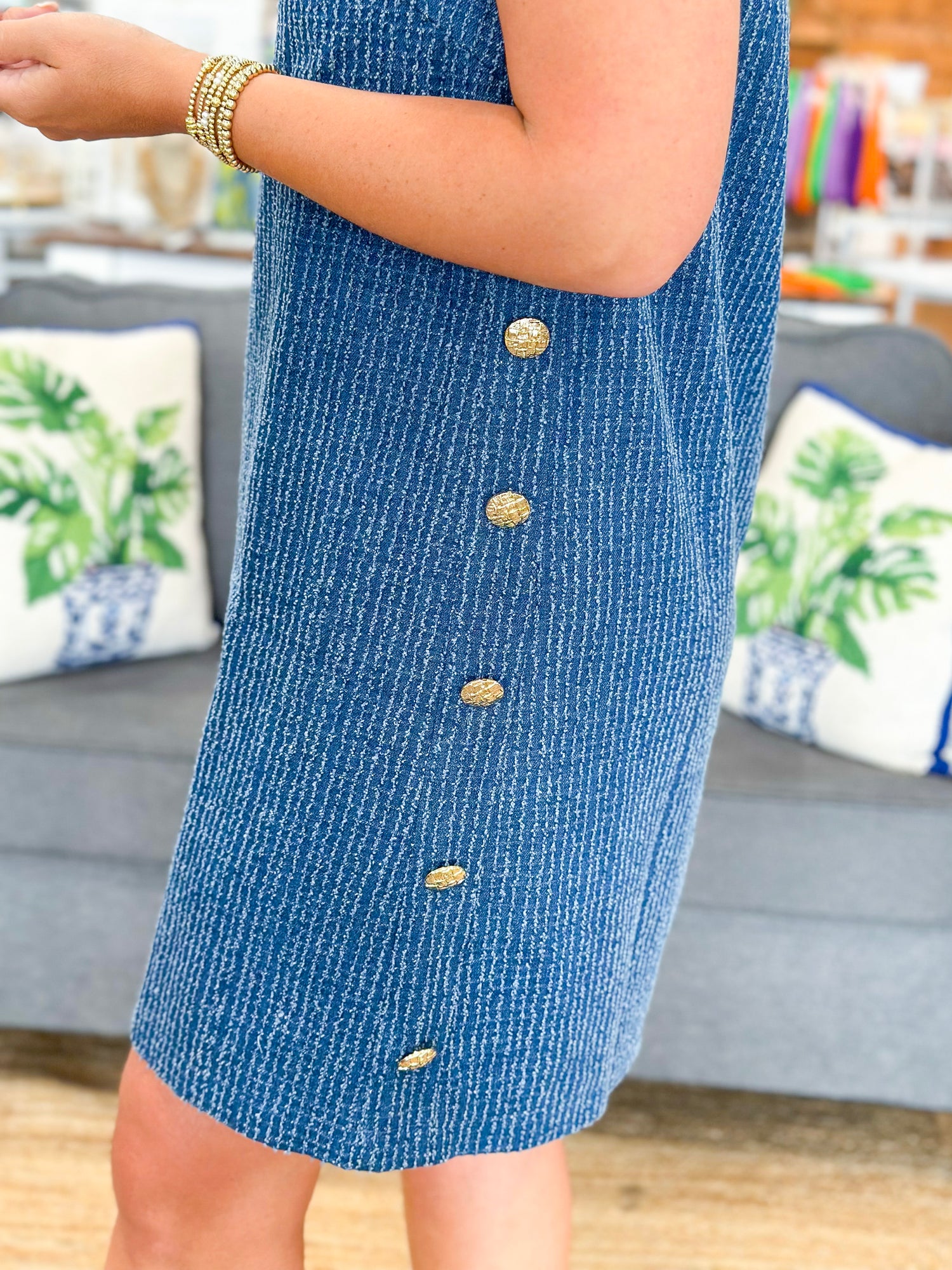 Effortlessly exude Chic Summer Style with our denim tweed mini dress! Designed with high-quality denim tweed fabric, this mini dress offers a timeless and fashionable look perfect for any occasion! Featuring gold button detailing along the sides of this mini, and raw hemline details on the sleeves and neckline! Elevate your wardrobe and elevate your style with our Chic Summer Mini Dress!
