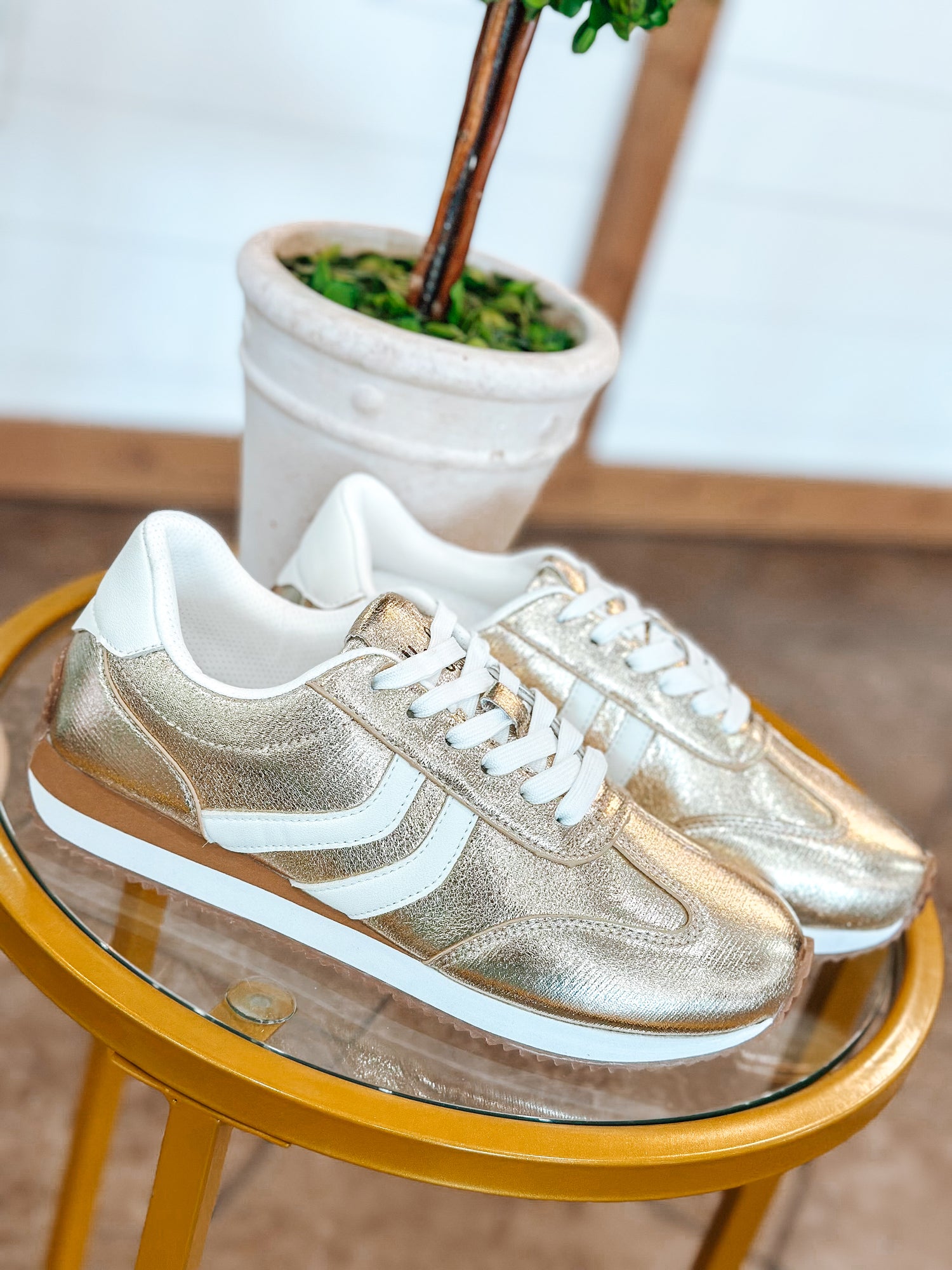 These sneakers feature a stunning metallic gold finish that instantly elevates even the most casual outfit — while still being easy, wearable, and comfortable enough for everyday life.
