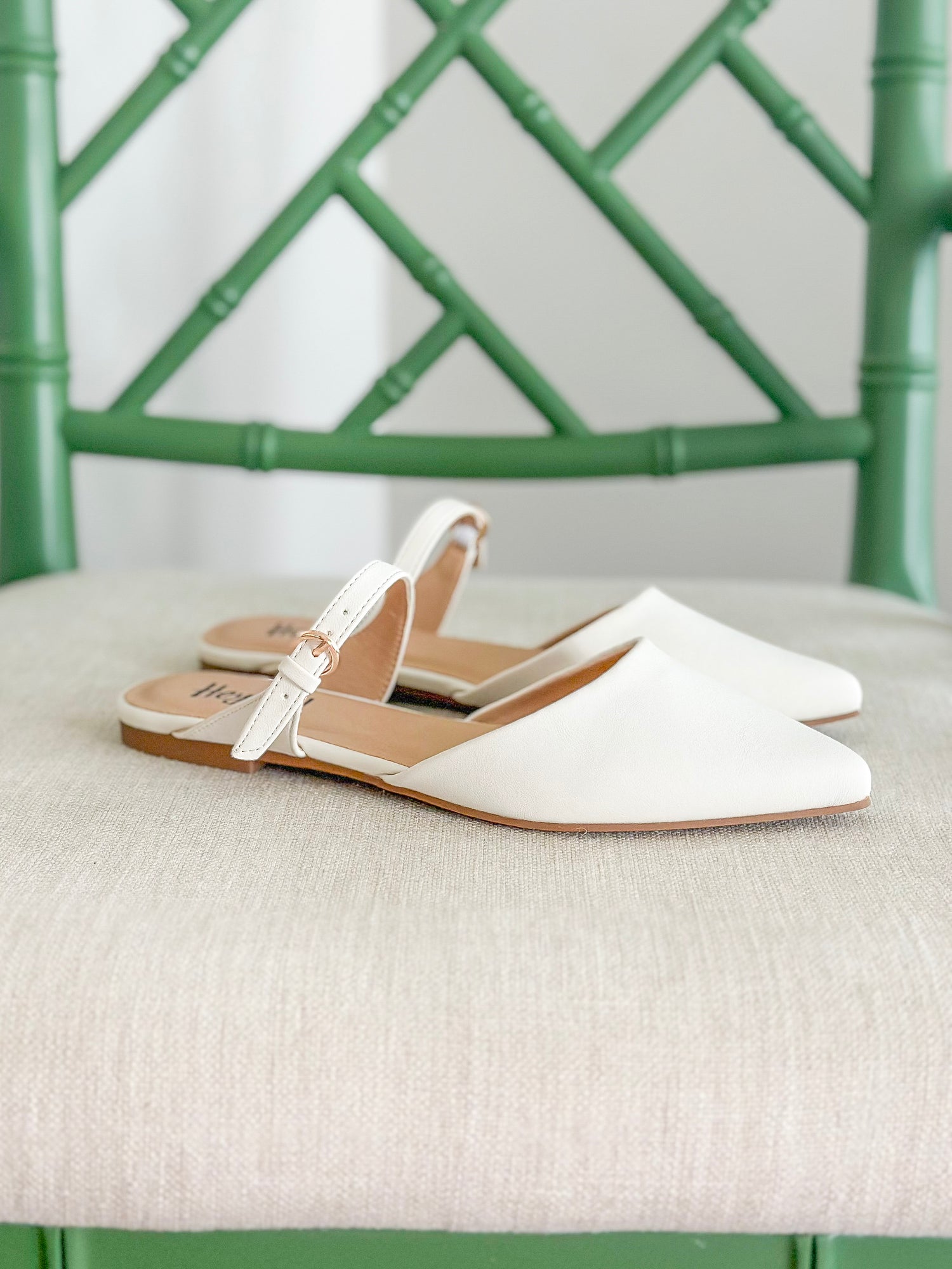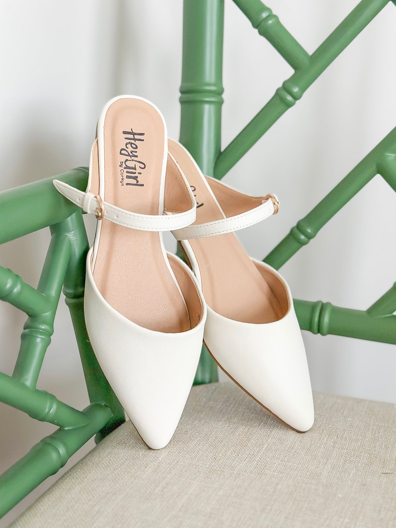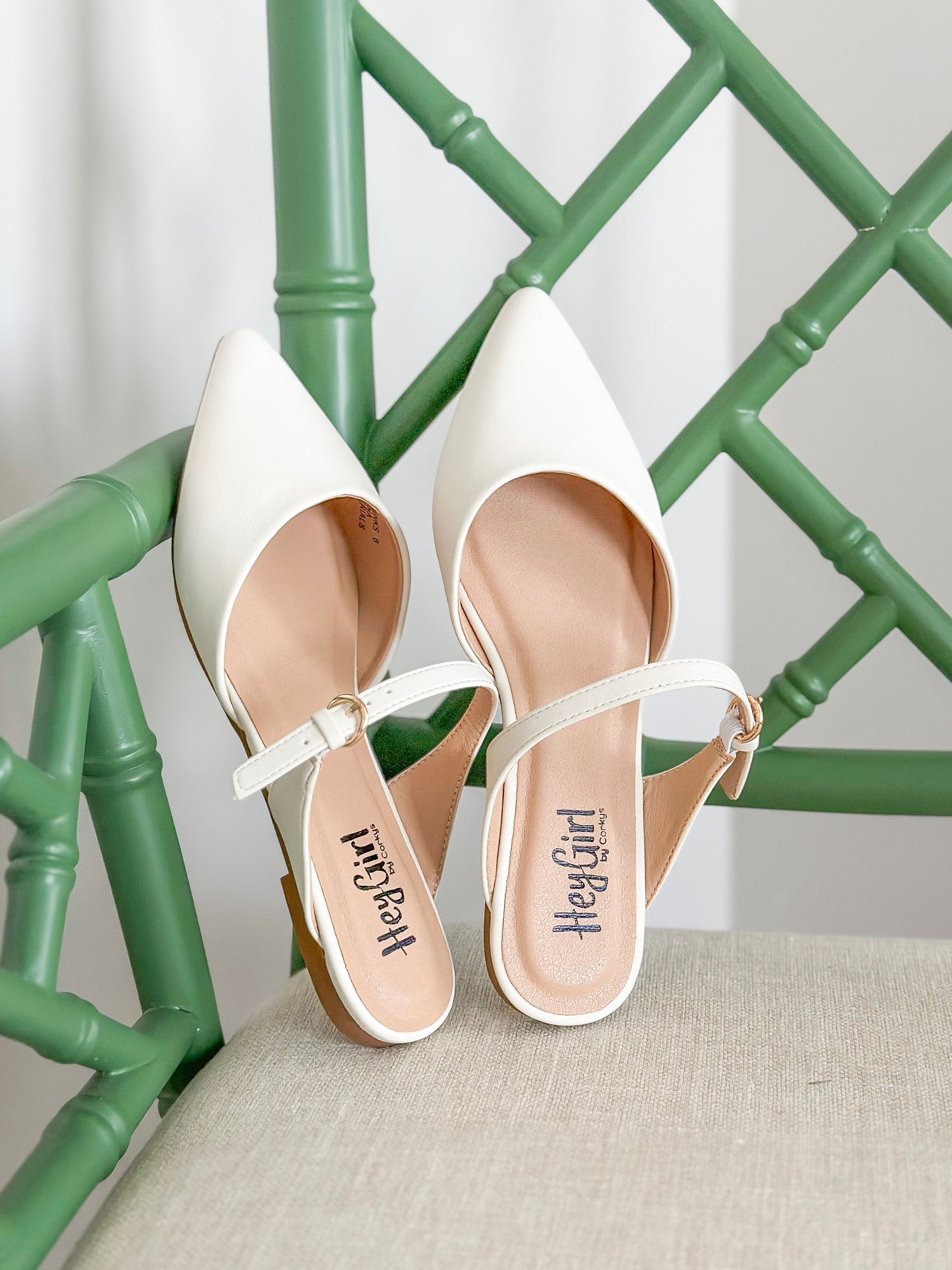 These classic slingback mules are made to stand out while staying effortlessly wearable. Featuring a sleek pointed toe, cream finish, and an adjustable slingback strap for a secure, comfortable fit, they bring just the right amount of elegance to everyday looks. Perfect for pairing with denim, dresses, or workwear, these flats add instant personality and polished style to any outfit.