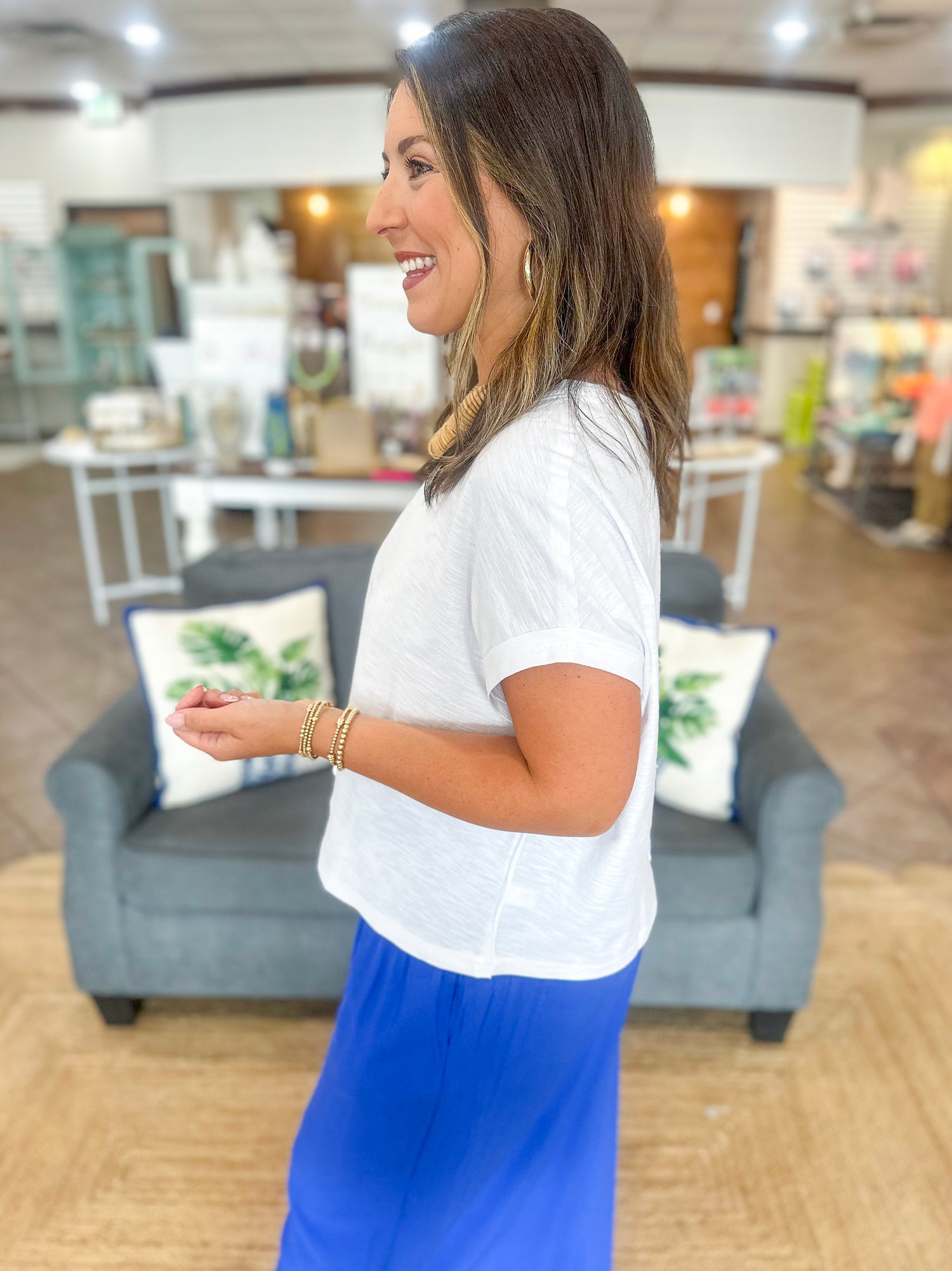 The Olivia Round Neck Tee in crisp white is your new go-to for effortless style and comfort! Its classic round neckline and soft fabric make it perfect for layering or wearing solo on sunny days! Whether you're dressing up with a blazer or keeping it casual with jeans, this tee adds a fresh, playful touch to any outfit! Embrace simplicity with a twist and let Olivia brighten your wardrobe!