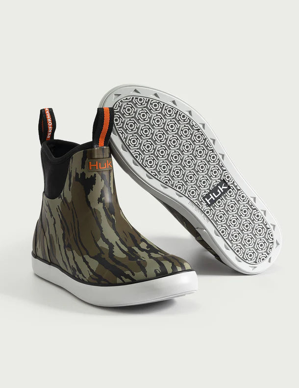 Sometimes, the best fishing is found in the worst conditions. Huk's Rogue Wave fishing boots are specifically designed for all-day comfort and engineered for optimal performance in any condition. These slip-on style mossy oak boots are constructed of incredibly durable neoprene rubber for protection from the elements and reliable strength. Carefully designed with positive traction in wet conditions, Huk’s exclusive Grip-X Slice outsole traction pattern and microchannels ensure stable footing that grabs in all directions, no matter how slick the boat deck or dock may become. Breathable mesh liners help ensure the boots stay dry on the inside, keeping the wet on the outside. The comfortable rounded toe and non-marking outer sole help make the Huk Mossy Oak Rogue Wave Boots the right fit for wet weather.