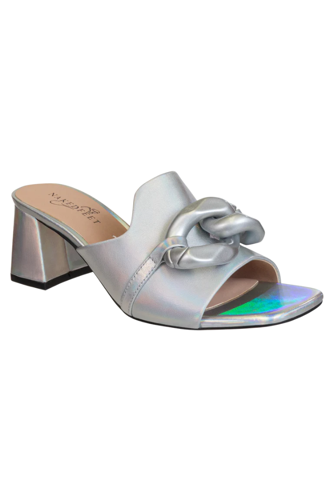 The perfect statement kitten heel for day to night, behold the Coterie in silver, raising the bar of elegance with a statement chain ornament and modern block heel. With its silver metallic hue and iridescent finish, this kitten heel makes a bold fashion statement in feminine opulence.