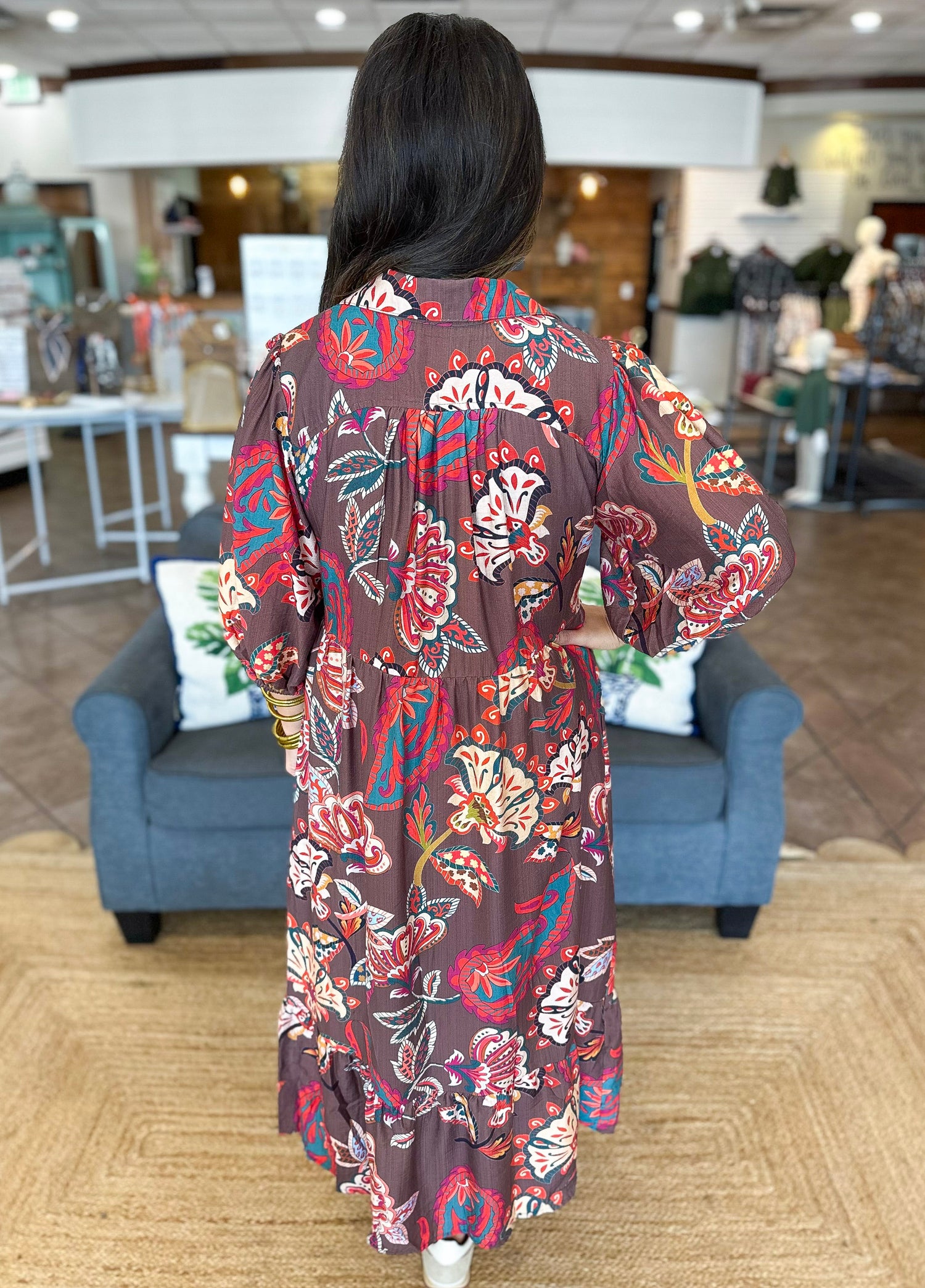 Fall in love with florals all over again in the October Florals Midi Dress! This eye-catching midi features a rich mix of autumn tones with a bold floral print that’s perfect for the season. Designed with a relaxed silhouette, flattering v-neckline, and flowy tiered skirt, it offers effortless style and all-day comfort. The ¾-length balloon sleeves add a touch of boho charm, while the soft, breathable fabric makes it ideal for transitioning from warm afternoons to crisp evenings! Pair it with sneakers (Back 70s are our FAV!) or boots!