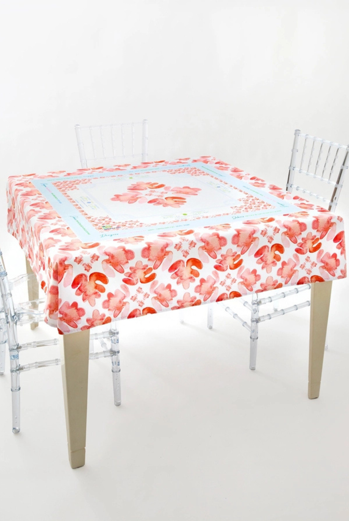 Prepare to elevate your Mahjong experience with our Mahjong Instructional Playing Tablecloth! Bid farewell to dull table covers as our vibrant poppy watercolor print, accentuated with pops of baby blue adds a touch of elegance to any gaming setup. This tablecloth features essential rules for American Mahjong, encompassing The Charleston, suit and dragon pairings, gameplay mechanics, wall direction, and the intricate "no jokers in a pair" rule. Enhance your game night with a blend of style and functionality! Dimensions: 56”x 56” 100% Polyester Machine washable. Iron on medium heat