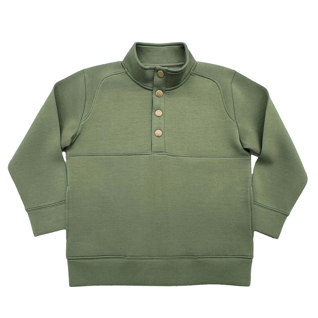 A Fall 25 bestseller, the Pierce Performance Pullover in Green is the perfect addition to your little man’s wardrobe this season. Crafted from ultra-soft scuba fabric, this mid-weight pullover keeps him warm and cozy on every outdoor adventure. Designed with practical pockets for chilly hands and featuring our signature khaki marlin embroidered at the back of the neck, it blends style and function effortlessly. Durable antique brass with marlin embossed snaps complete the look, making this pullover a must-have for cool weather days.