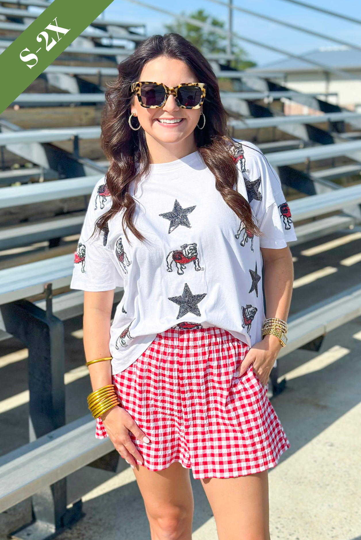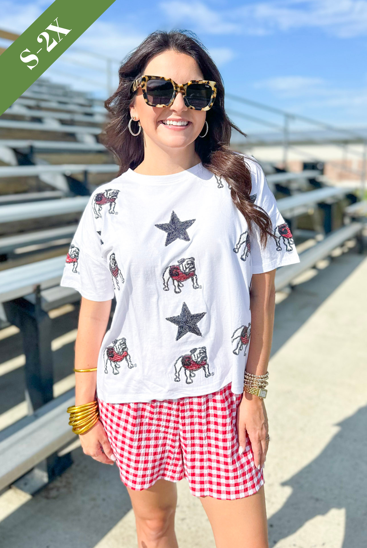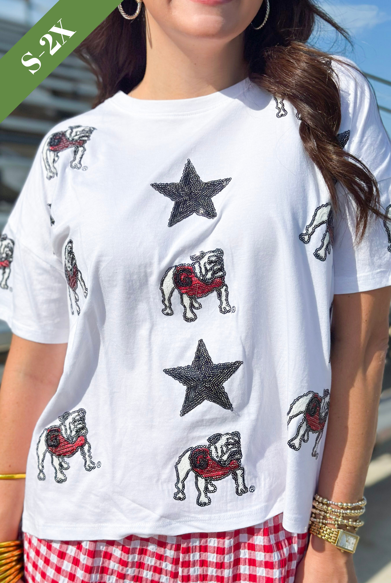 Show your Bulldog pride with a sparkling twist in the Georgia All Over Sequin Boxy Tee! This playful top dazzles with shimmering sequins that catch every eye, while its relaxed boxy fit keeps you comfy whether you're cheering in the stands or out on the town! Perfect for fans who want to shine bright and stay cool, this tee combines spirited style with expert craftsmanship!