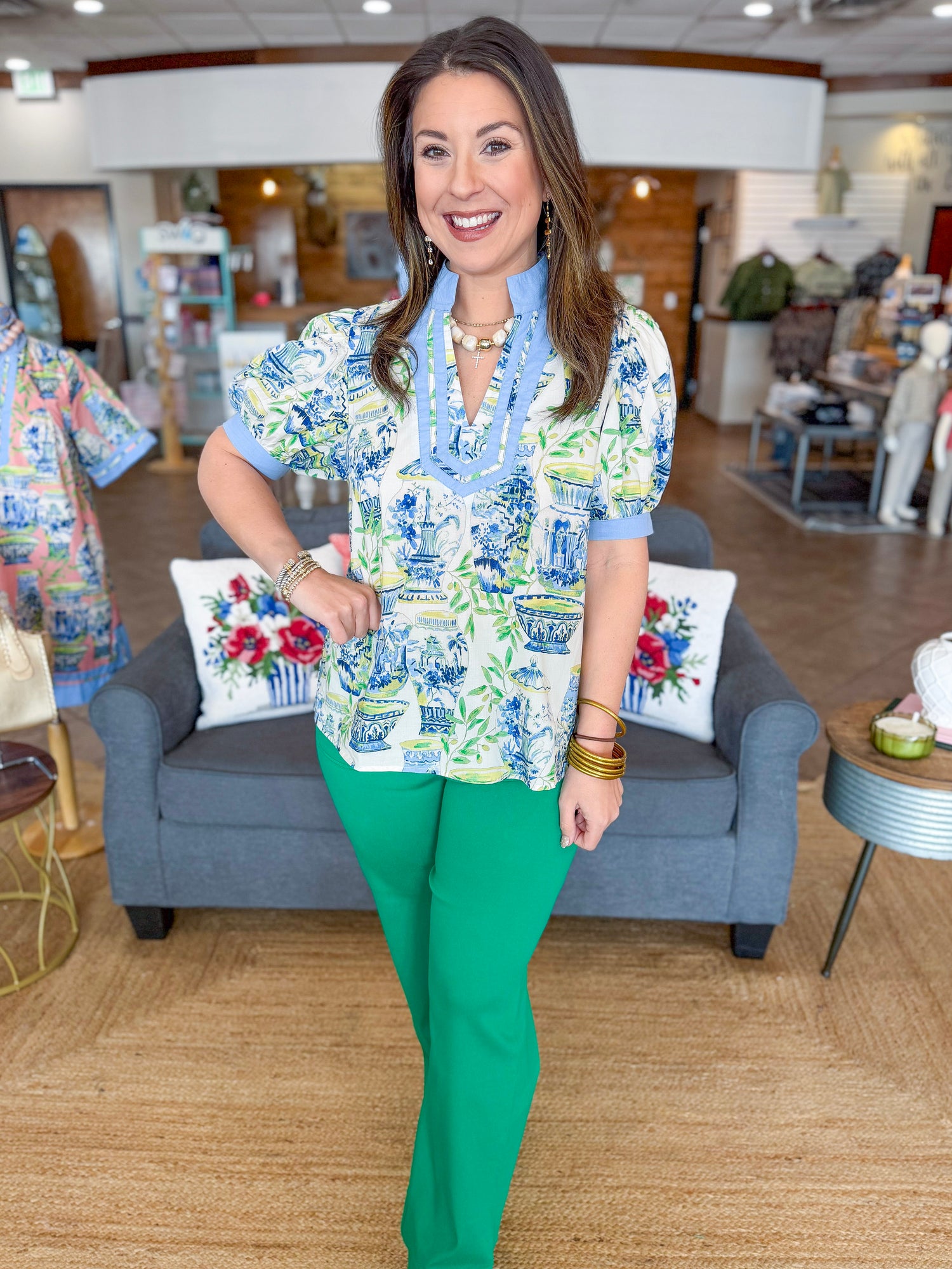 The Canton Top is a classic favorite with a fresh, colorful twist. Featuring a beautiful chinoiserie-inspired print in soft blues and greens, this top feels timeless yet effortlessly current. The contrast split neckline adds a flattering focal point, while the relaxed silhouette and lightweight fabric make it comfortable for all-day wear. Finished with subtle sleeve details, the Canton Top pairs perfectly with denim, trousers, or your favorite spring pants for an easy, pulled-together look.