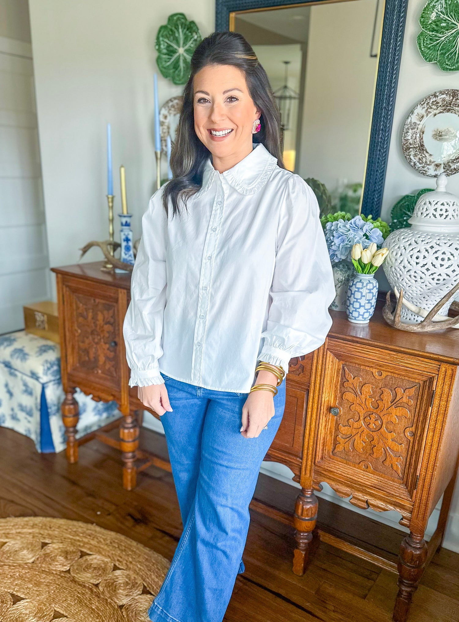 Timeless, polished, and effortlessly feminine, The Charlotte Ruffle Collar Top is a spring wardrobe staple you’ll wear again and again. Designed in a soft chambray-blue hue, this blouse features a delicate ruffled collar, subtle puff sleeves, and a clean button-front silhouette that feels classic with a fresh twist.