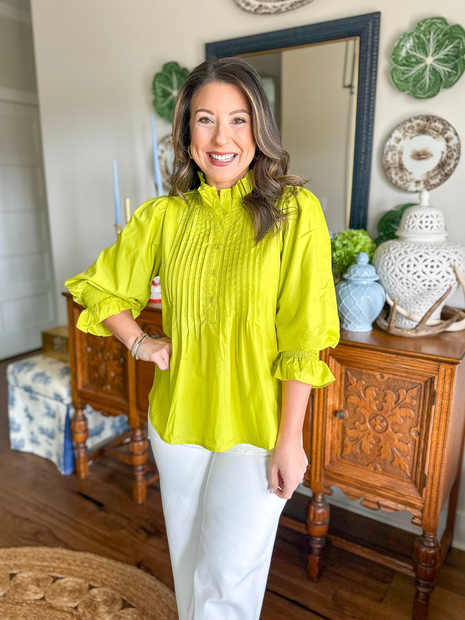 This vibrant chartreuse top is a standout staple designed to elevate your everyday wardrobe. Featuring delicate pintuck detailing along the bodice, a soft ruffle collar, and gently puffed sleeves with elastic cuffs, it blends classic charm with modern ease. The lightweight woven fabric offers beautiful structure without feeling stiff, making it perfect for workdays, luncheons, and weekend gatherings alike. Style it with white denim or tailored trousers for an effortlessly refined look.