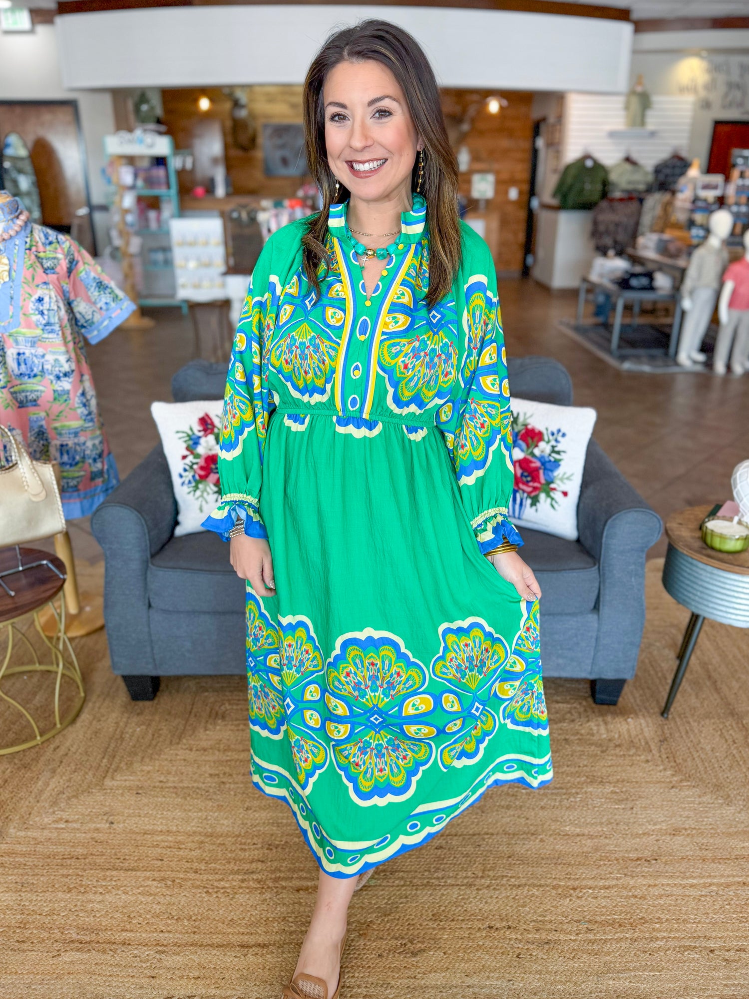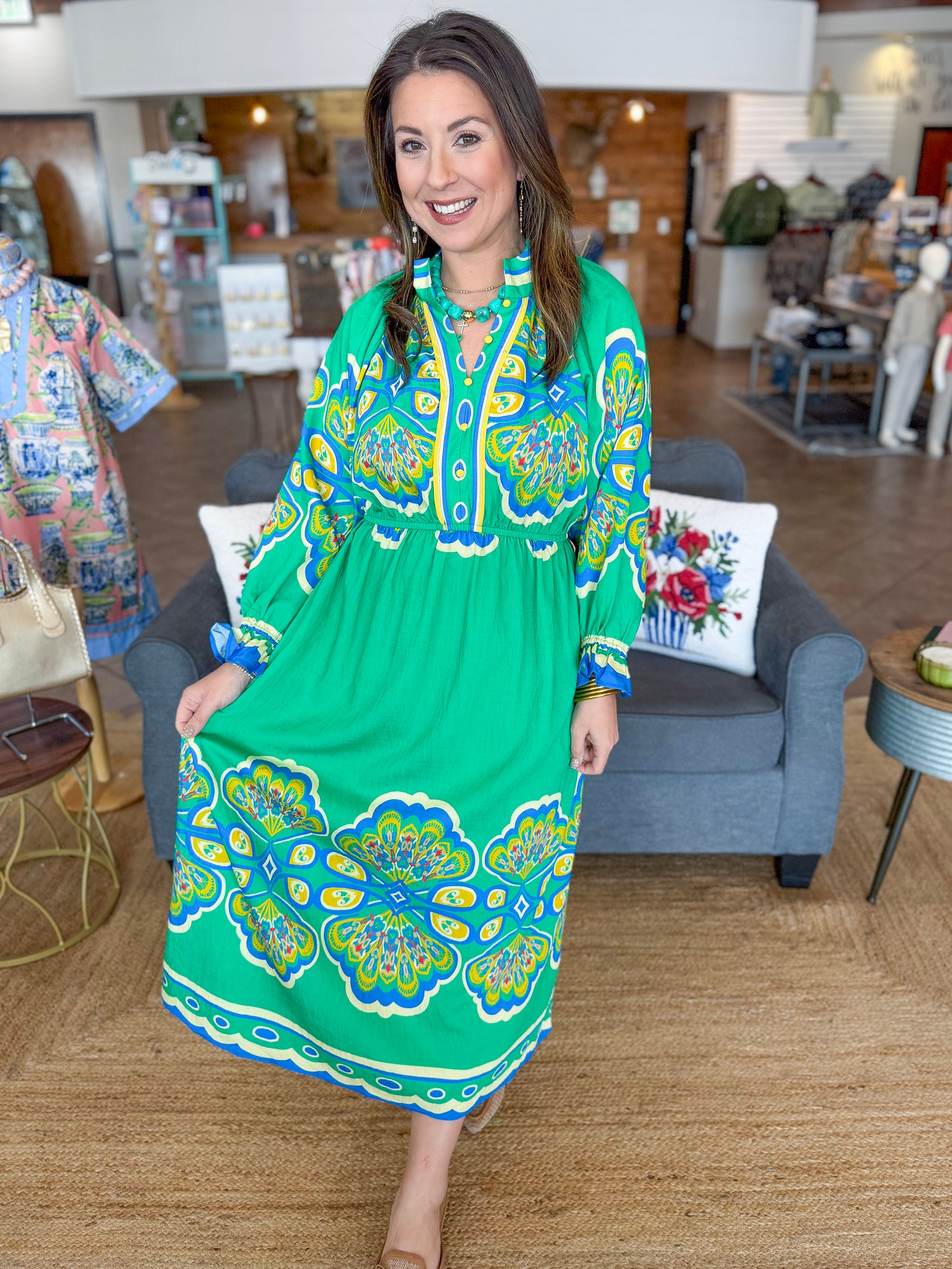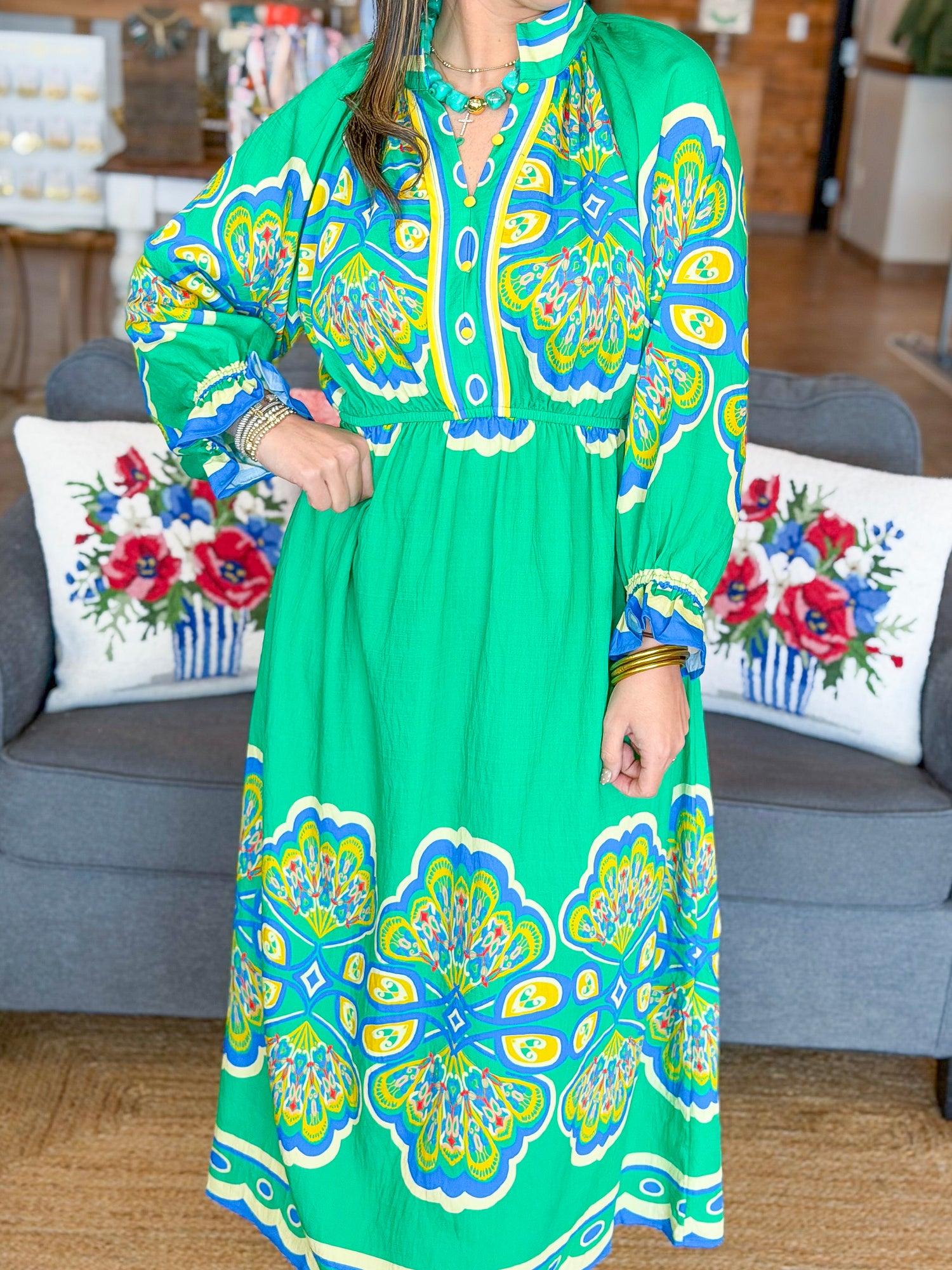 The Juliette Dress is a vibrant, statement-making piece designed to turn heads while still feeling effortless. Featuring a bold, colorful print and a flattering empire waist, this dress offers beautiful movement and an easy, comfortable fit. The long sleeves with subtle gathered details add a touch of elegance, while the lightweight fabric keeps it breathable and wearable all day long. Whether you’re heading to a special event or simply want to brighten your everyday style, the Juliette Dress brings instant joy to your wardrobe.