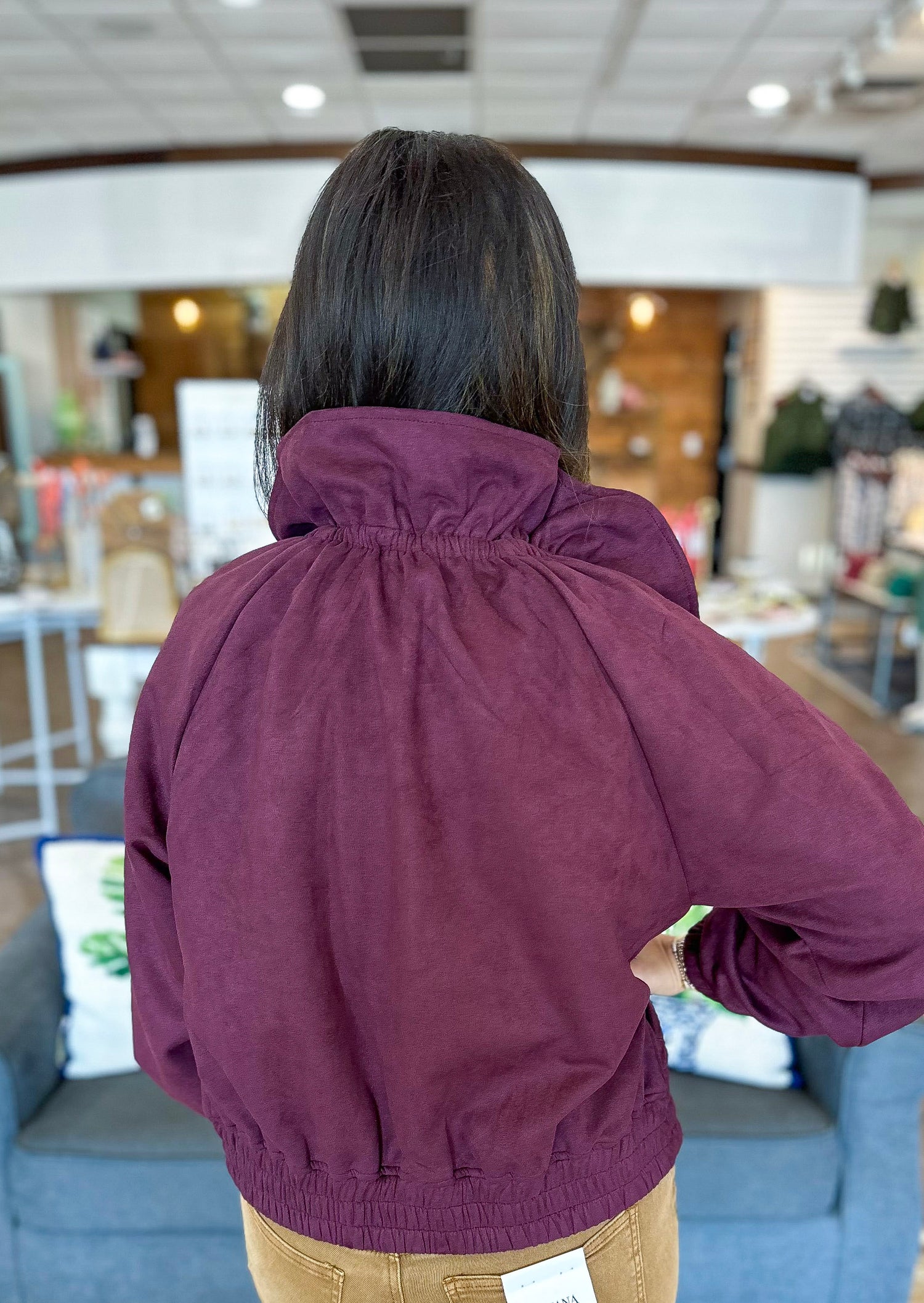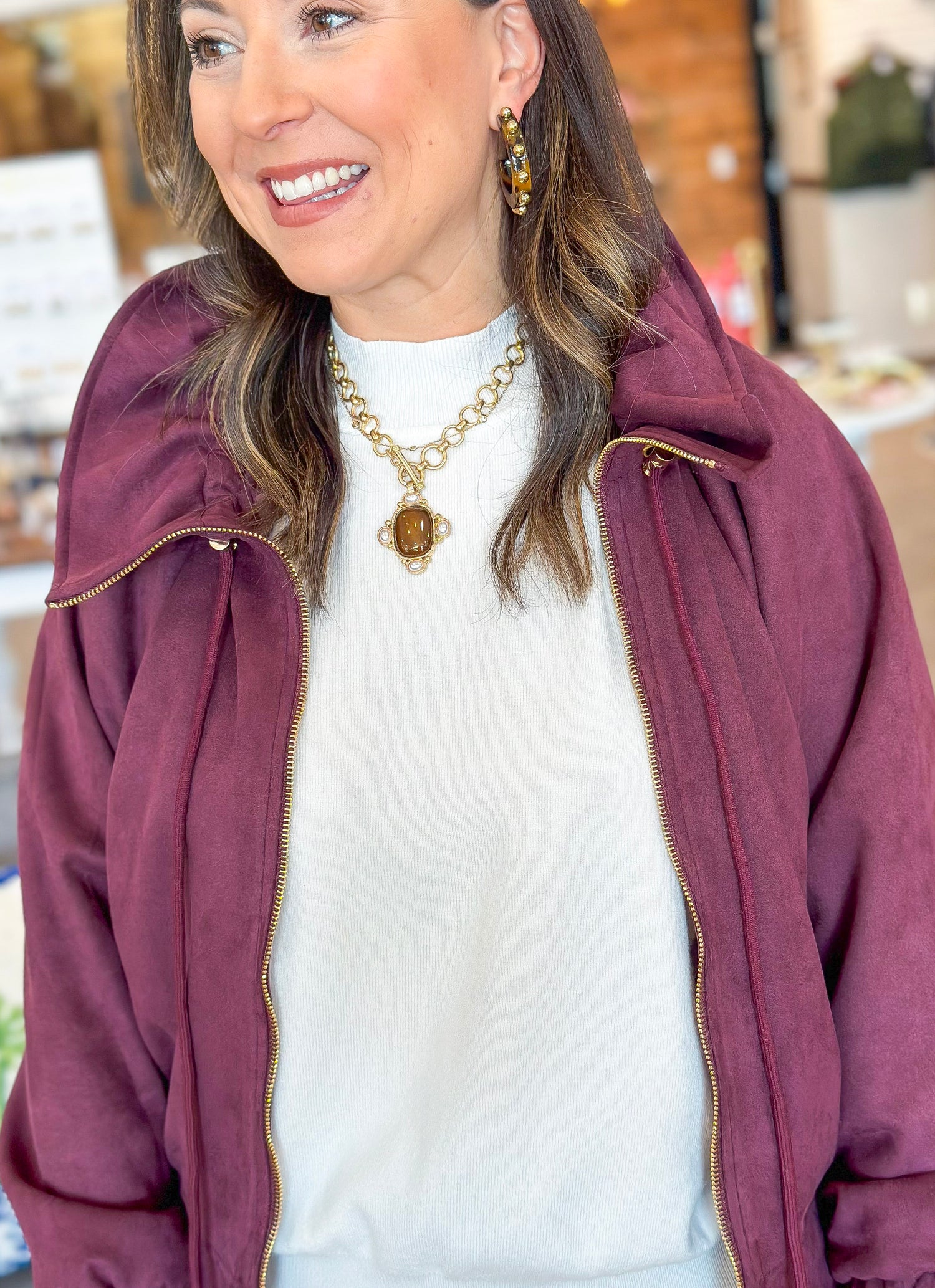 The Westwood Suede Zip Jacket brings effortless sophistication to every outfit! Available in rich merlot and classic chocolate, this faux suede jacket features gold hardware, front pockets, and a feminine ruffled collar for that perfect blend of polish and edge.