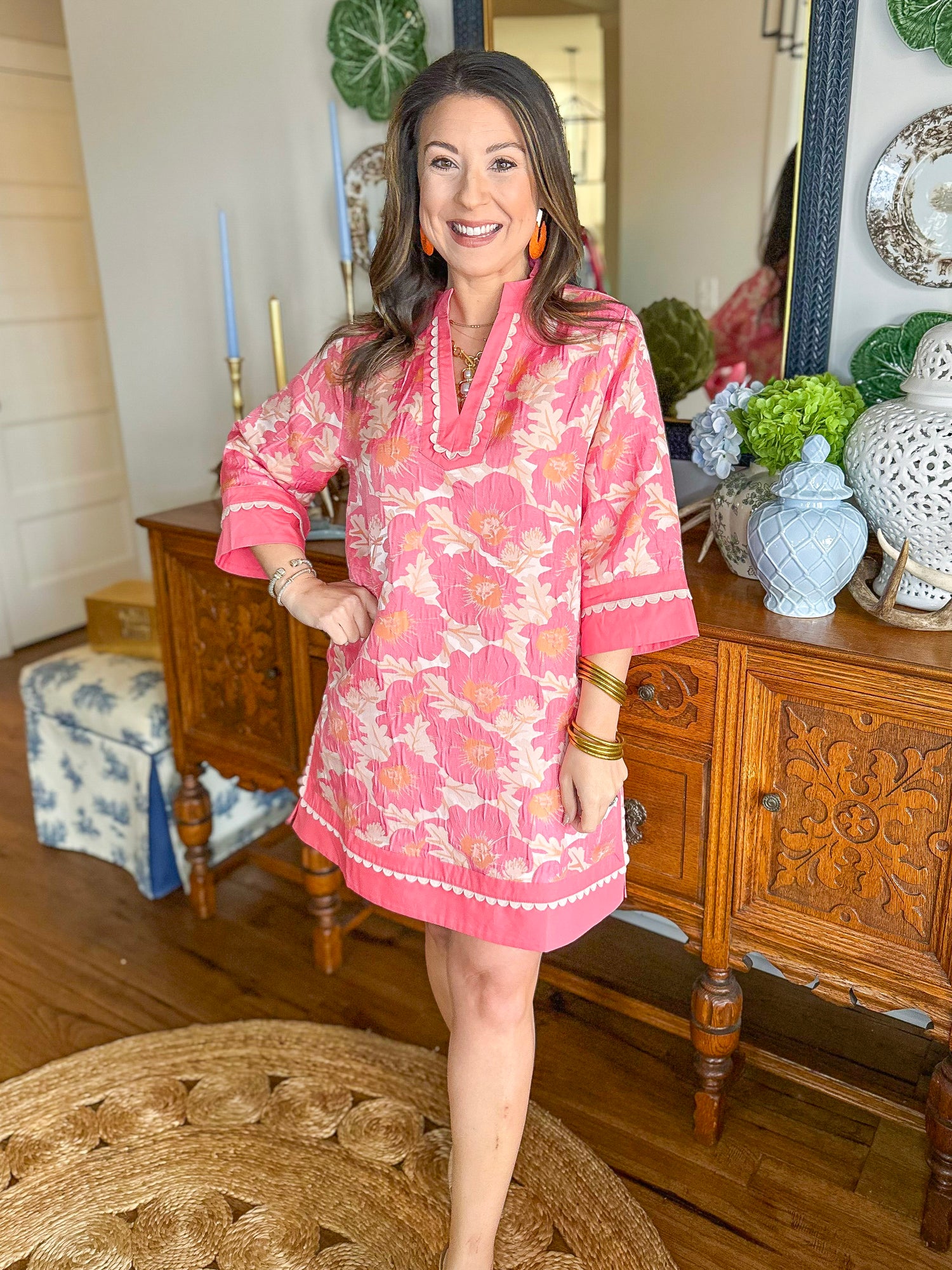 Classic, polished, and effortlessly feminine, The Worth Avenue Dress feels like springtime at the club, brunch with friends, and sunny afternoons spent strolling somewhere beautiful. The soft pink floral print paired with scalloped trim details creates a timeless silhouette that feels both playful and refined. The relaxed fit, flattering neckline, and easy sleeve length make this one of those dresses you’ll reach for again and again when you want to look put together without overthinking it.