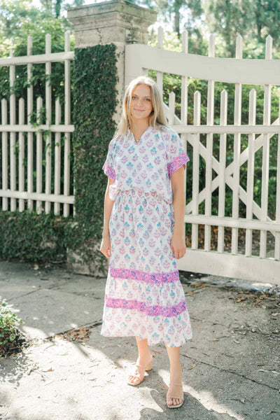 The Cora Skirt features an adjustable drawstring waist, tiered skirt, and side pockets. Pair with the Cora Blouse for a matching set.