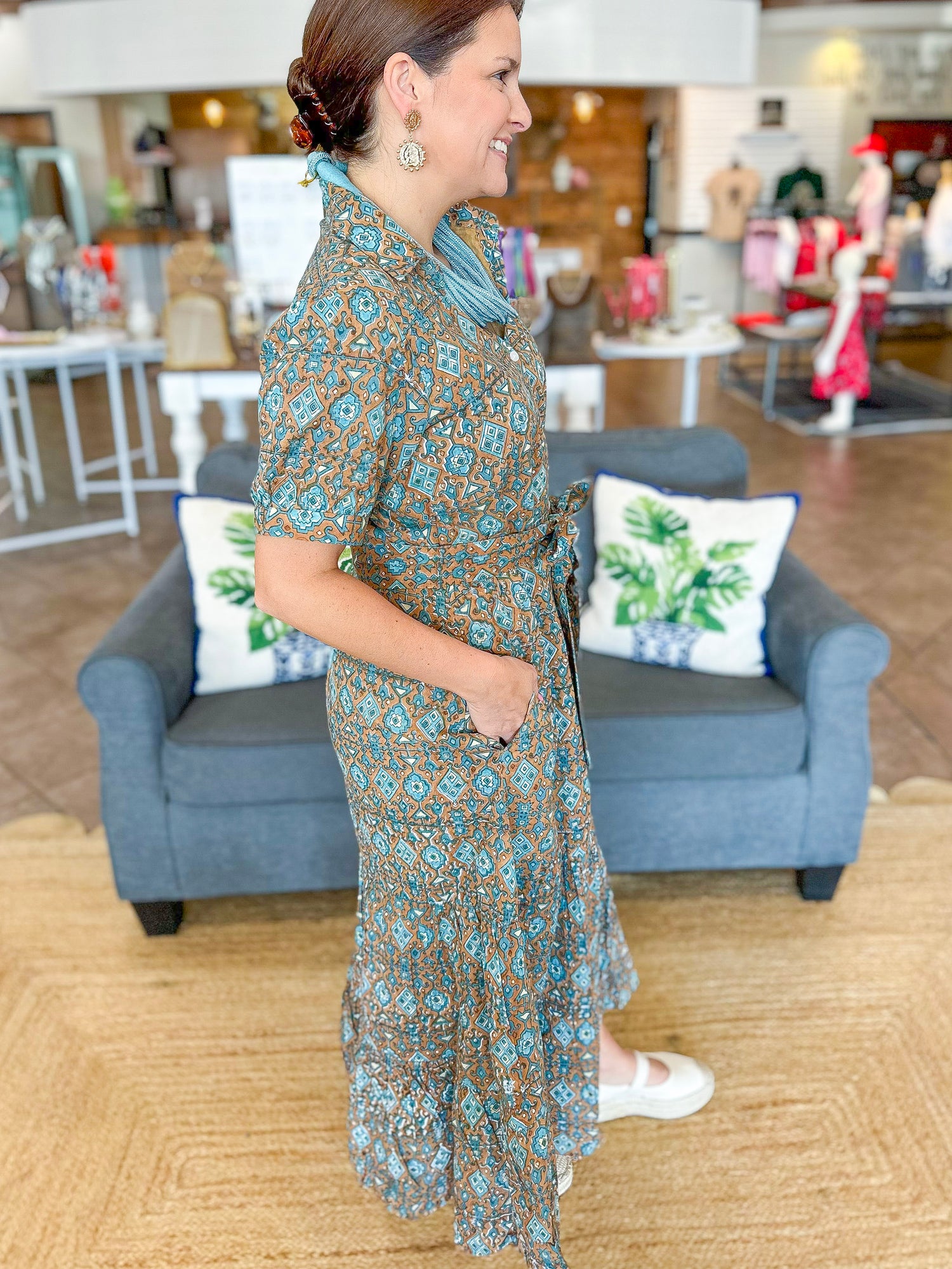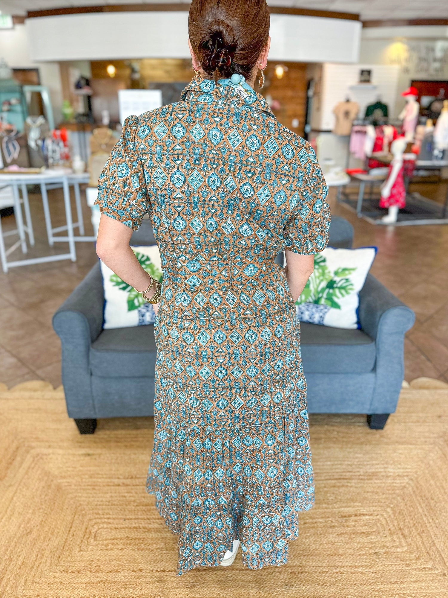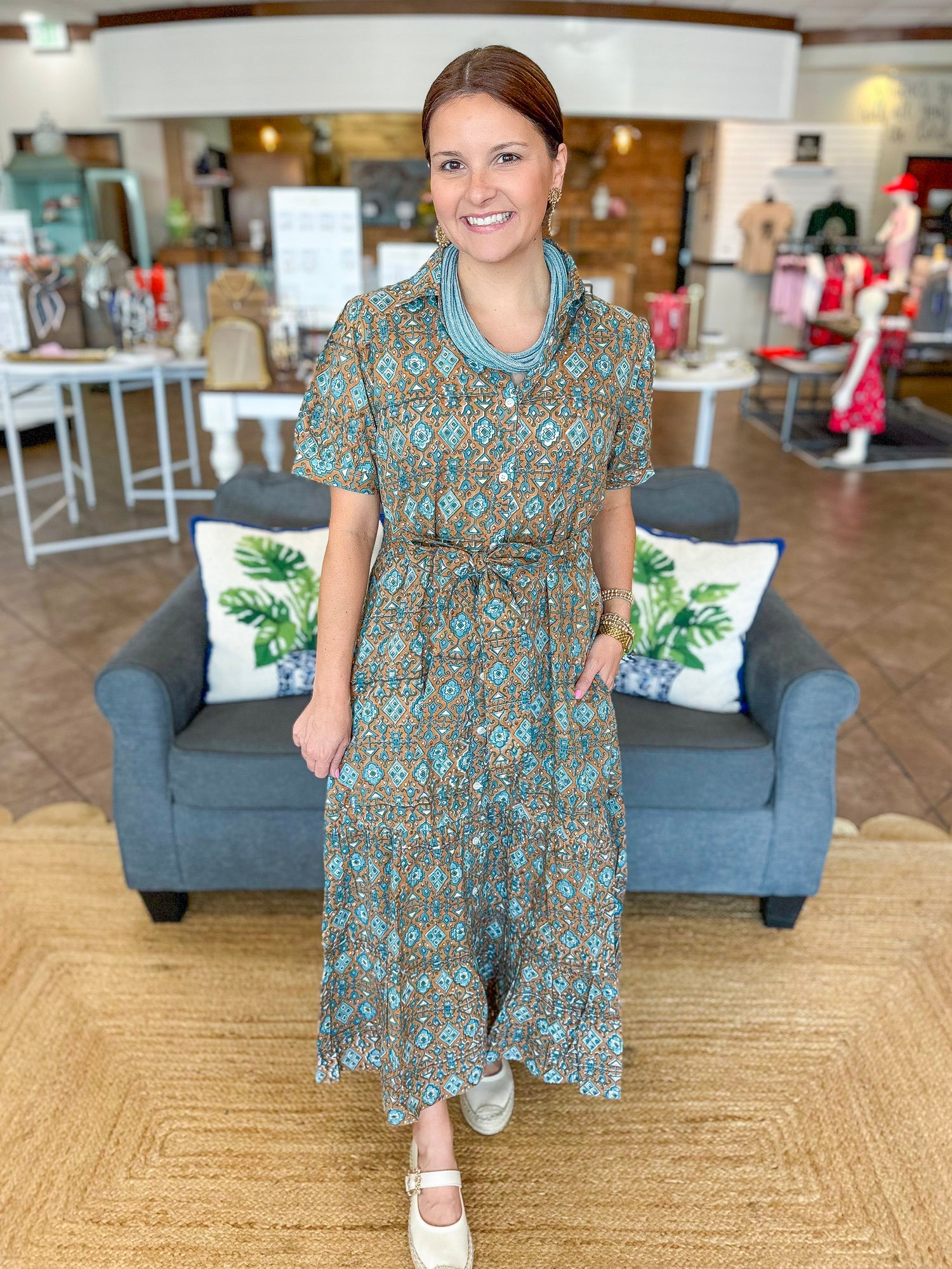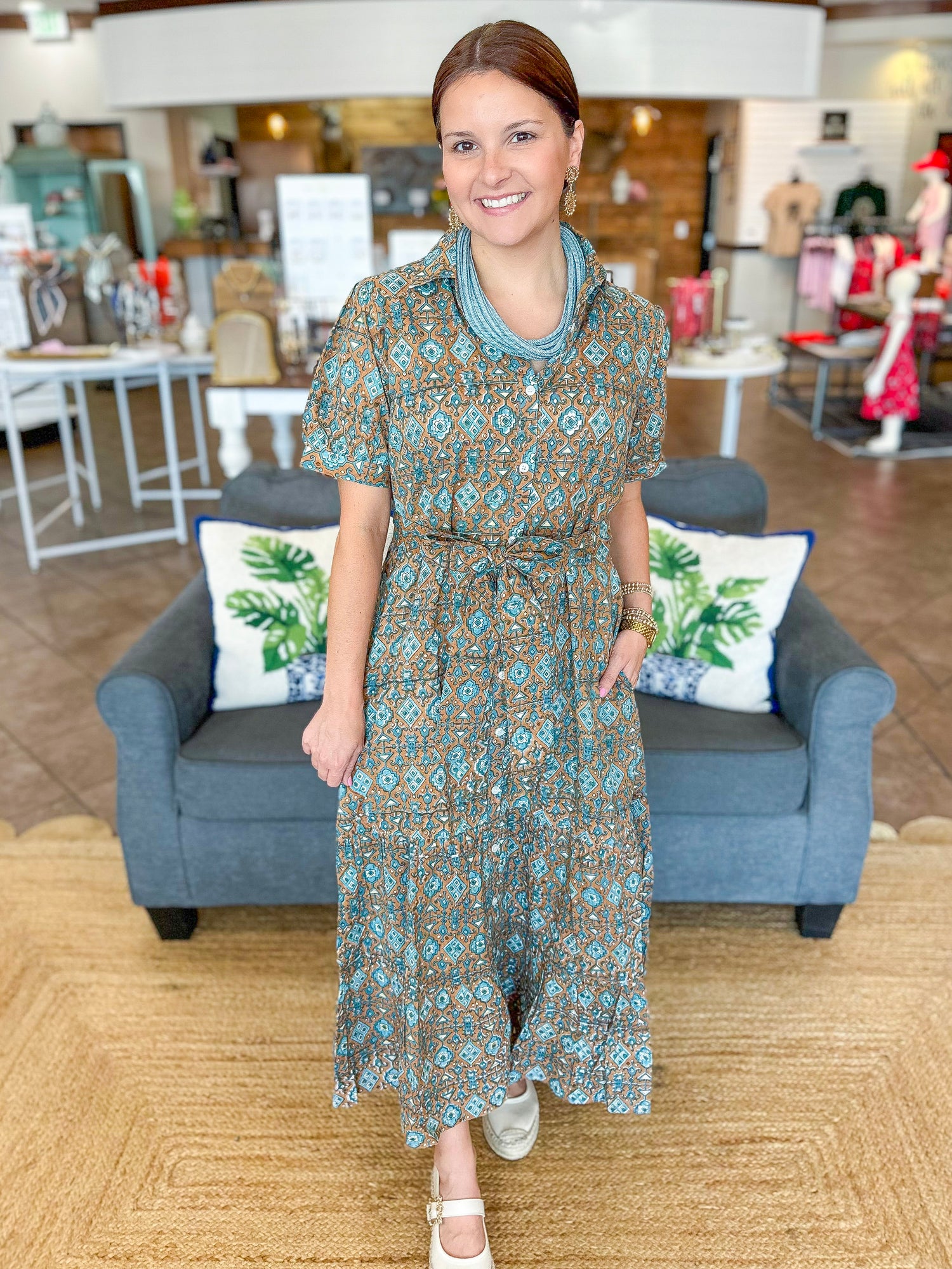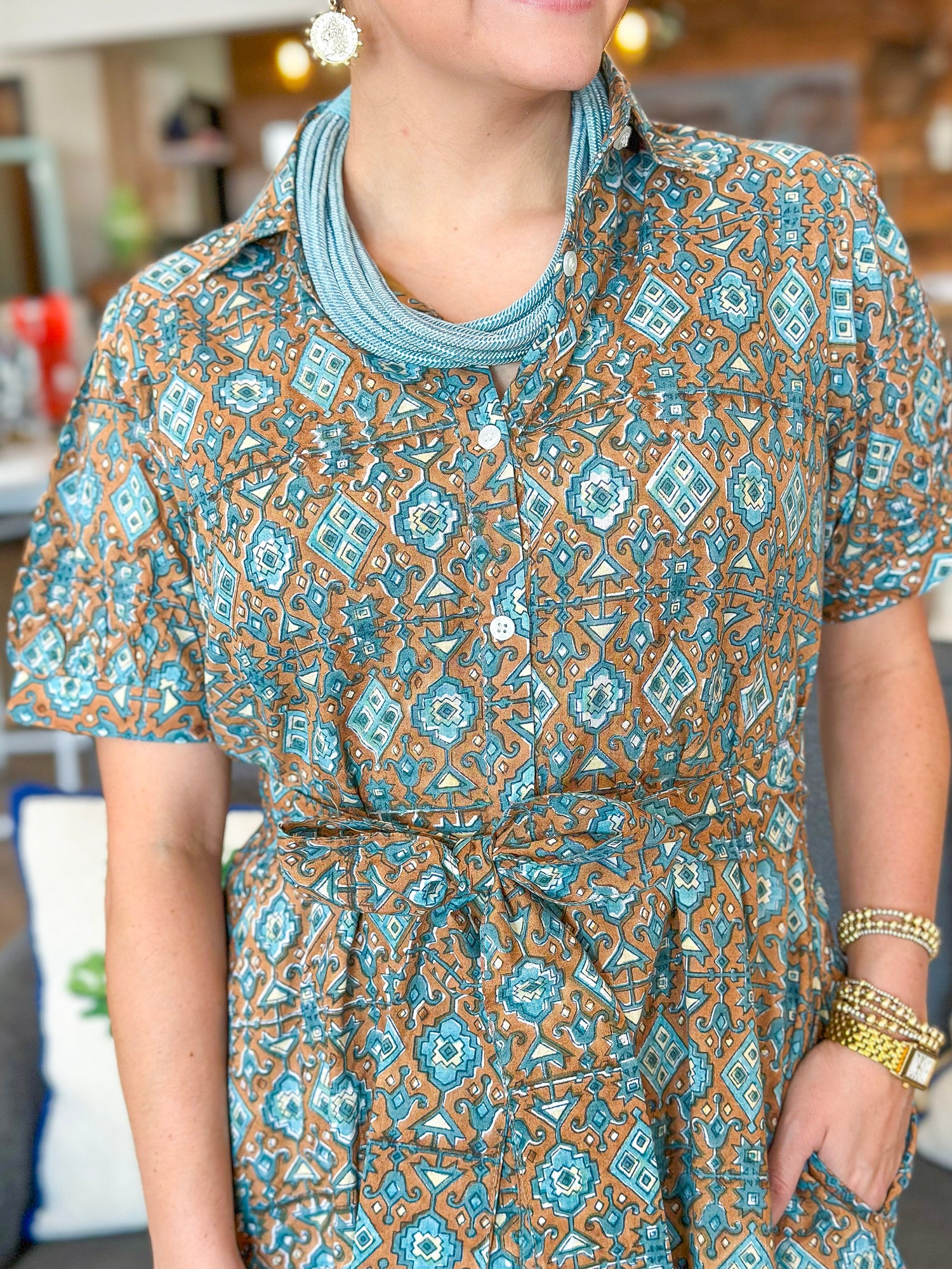 The Val Dress is a timeless silhouette with modern charm. Designed with a crisp collar and button-front placket, it features short puff sleeves and a tiered skirt that create a feminine, flattering shape. Side pockets add everyday ease, while a matching printed self-tie belt defines the waist for the perfect finishing touch.