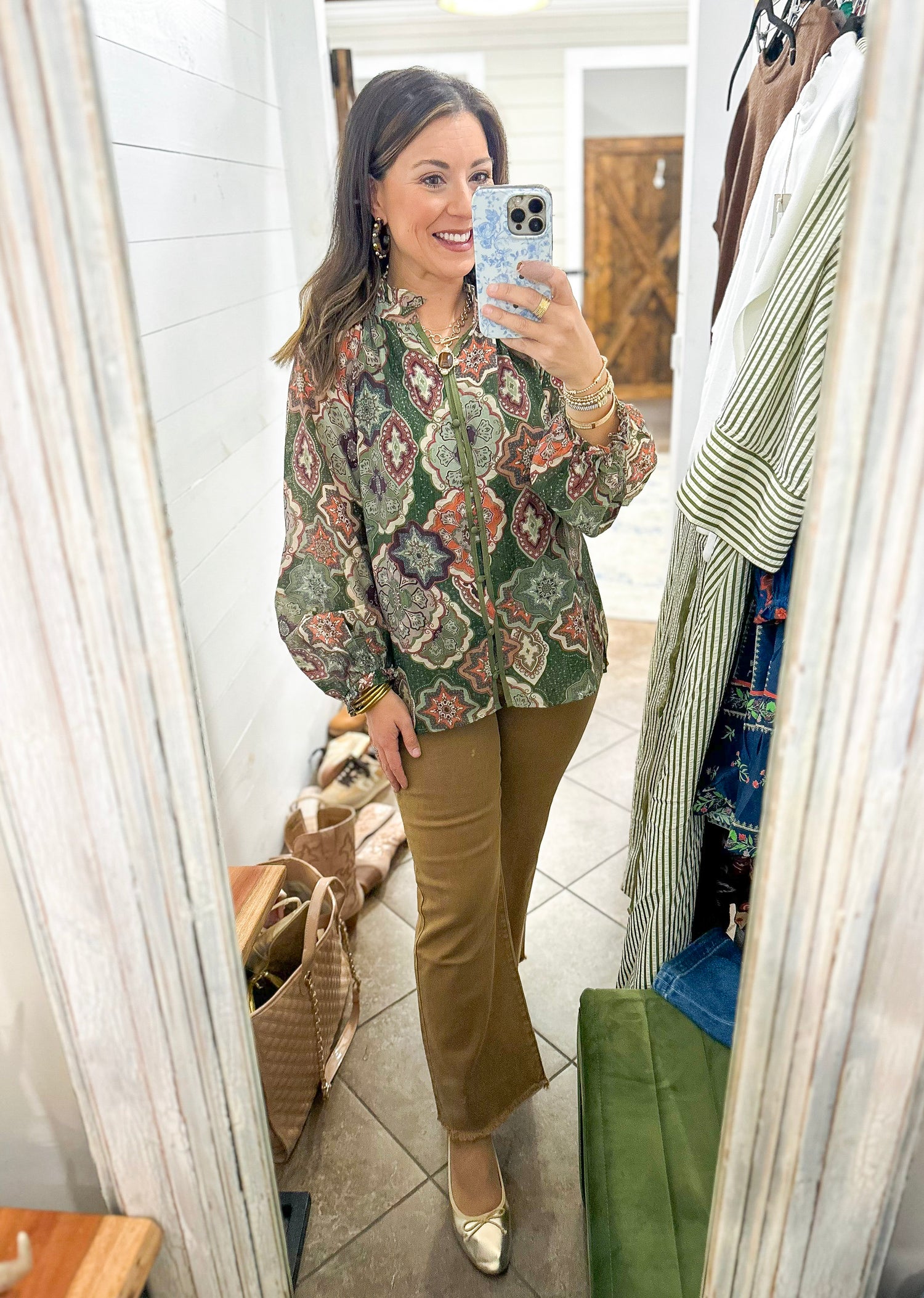 Embrace effortless bohemian charm with the Willow Lane Top! This button-down blouse features a stunning olive mix mosaic print that adds a touch of artistry to your everyday style. Designed with long, billowy balloon sleeves and a relaxed fit, it offers both comfort and sophistication. Crafted from a lightweight blend, the fabric drapes beautifully with a soft, airy feel. Perfect for pairing with denim, skirts, or your favorite trousers, the Willow Lane Top is your go-to piece for a look that’s as free-spirited as it is timeless.